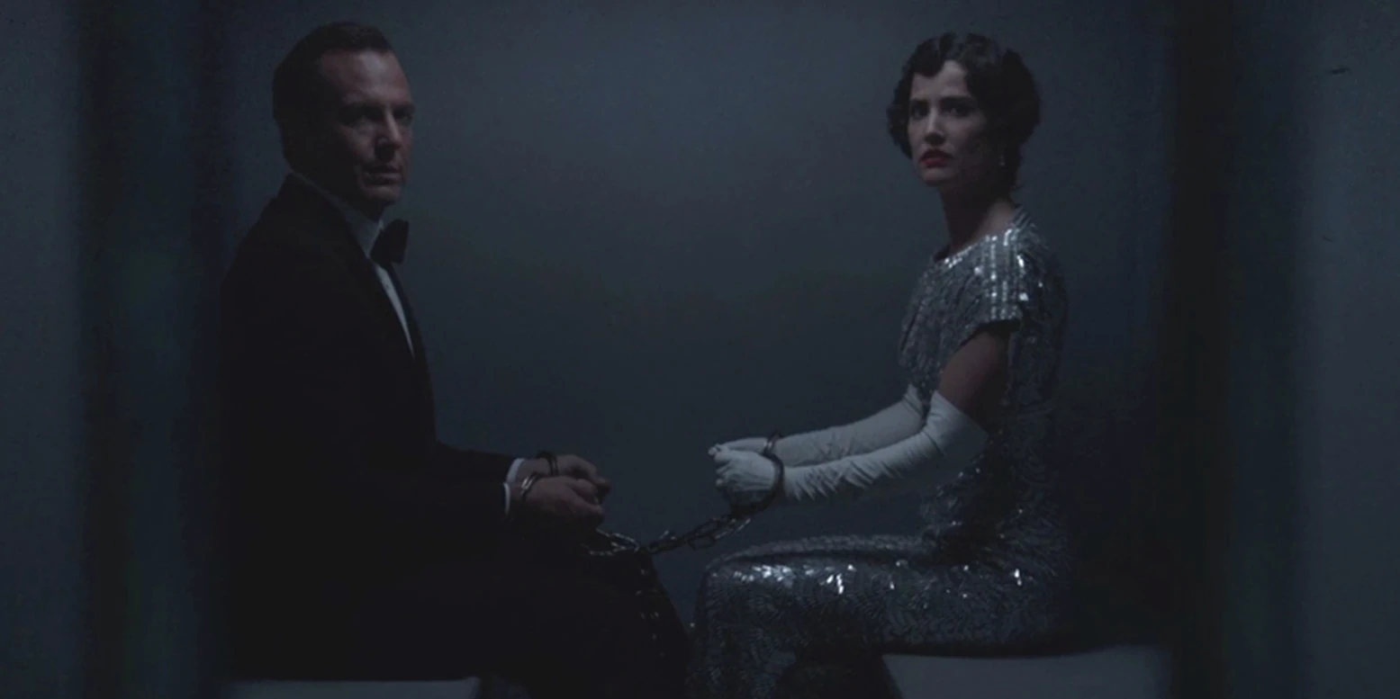In a truck, a handcuffed man in a suit and a woman in a dress express their urgent need to get back to '"he children."