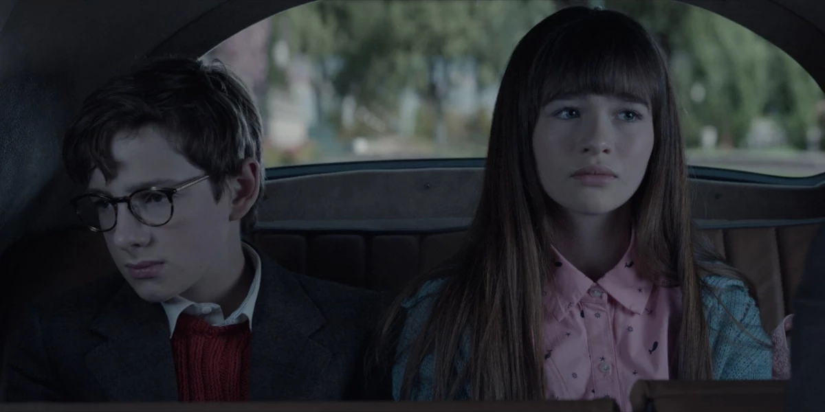 The Baudelaire children, now the Baudelaire orphans, look back as they're driven away from their ruined mansion.