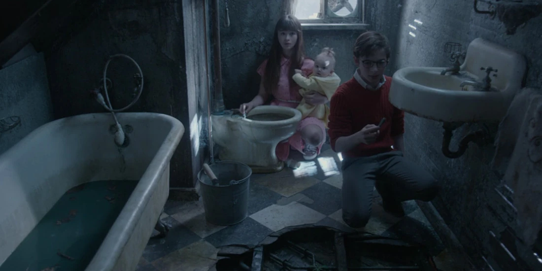 The Baudelaires cleaning the grimy bathroom