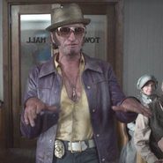 He wears a brown hat with a feather on it, large sunglasses to cover his eyebrow, he gets a gold tooth to look ‘cool’ and is always chewing on a match. He wears a yellow shirt which is only buttoned half way, showing his chest, a yellow necklace, a purple coat, and long black trousers with a large white belt. He wears cowboy boots. He speaks in a western accent and uses scat singing to get out of situations.