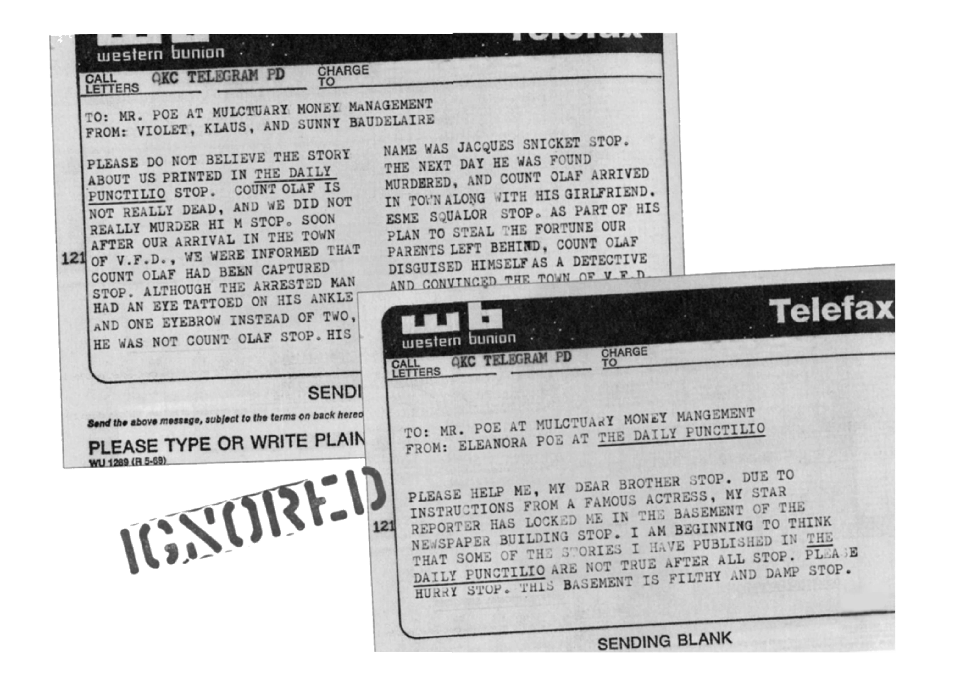 Eleanora was then locked in the filthy and damp basement of the newspaper building- presumably near the printing press- by Julienne, under the instructions of Esmé Squalor. Realizing that some of the stories she published in her paper were untrue, she sent a panicked telegram to her brother to help her get out. Unfortunately, Arthur had recently read her article on the dangers of telegrams and never received the message.[1]