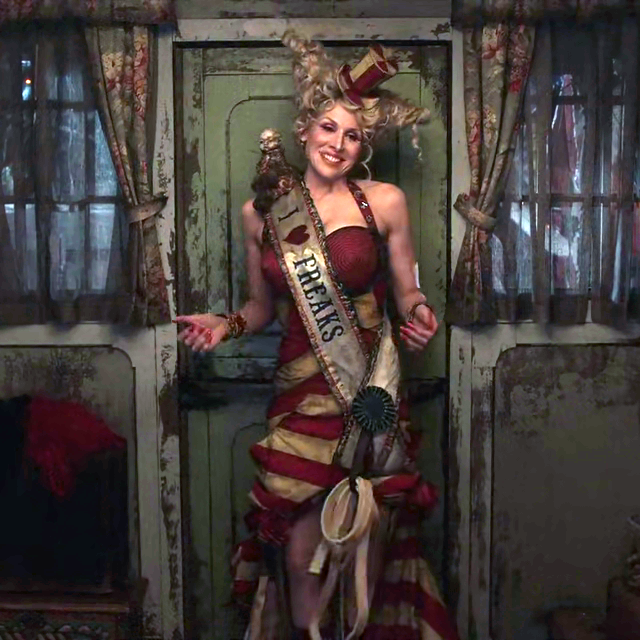 She dons a variety of items, including a sash reading "I Love Freaks", in order to seem accepting of the people employed in Caligari Carnival's freak show: Hugo, Kevin and Colette. She appears to care about their fates and attempts to convince them all to join Olaf's troupe, flattering most of the freaks into adoring her. The freaks are excited at the idea of joining Olaf's troupe, but the price they'd have to pay is throwing Madame Lulu into a pit of lions. Esmé is jealous of the fortune teller and is sick of Olaf buying her presents, so in order to quell the freaks' misgivings, she gives them disguises to help them appear more normal. Hugo, Kevin, and Colette are thrilled and agree to murder Madame Lulu.
