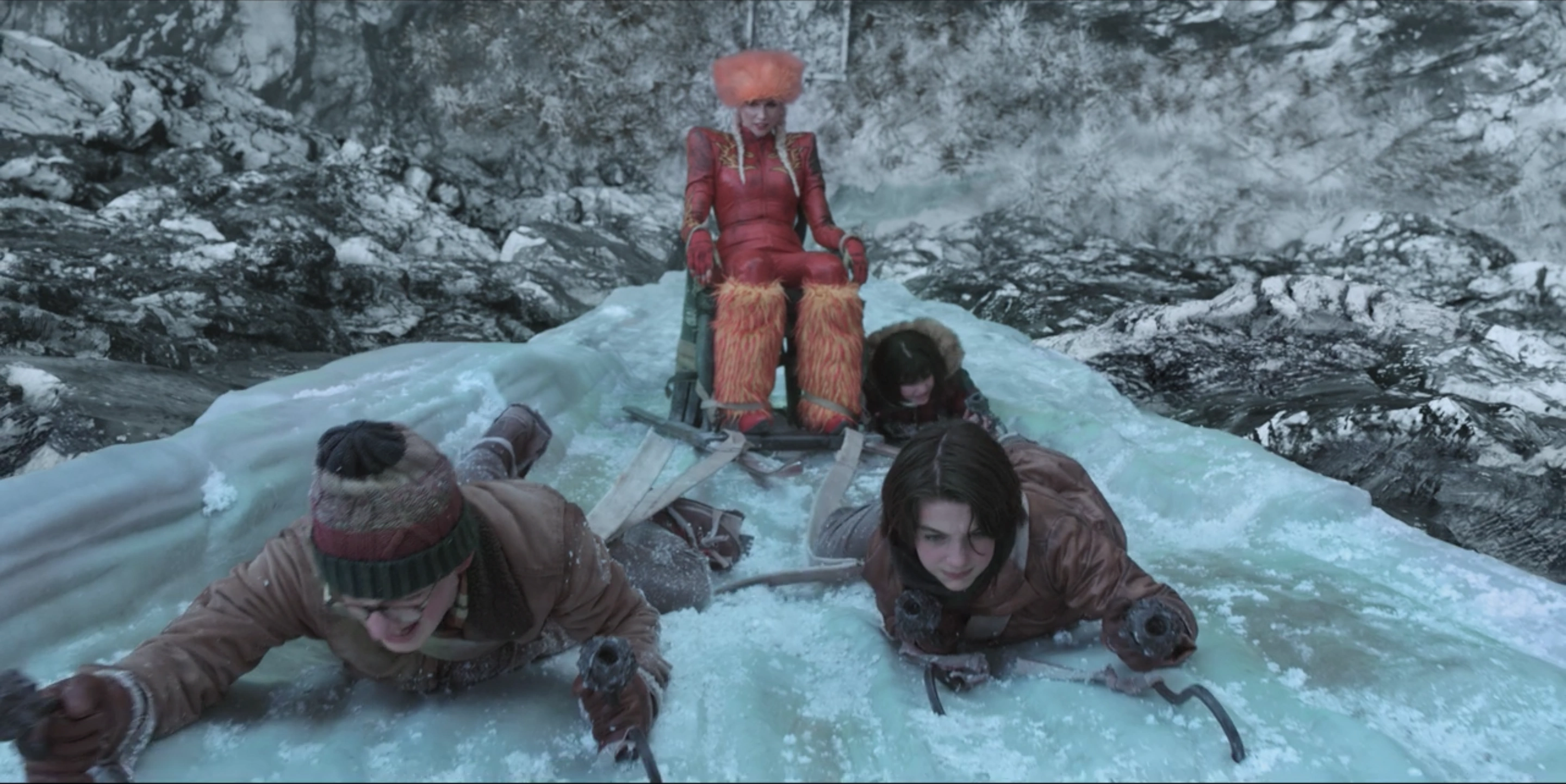 The Baudelaires and Quigley pulling Esmé up the mountain.
