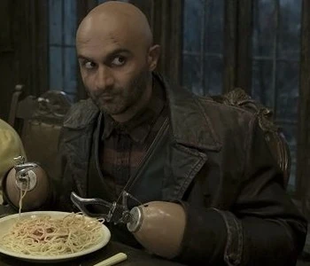 He is first seen with the rest of the acting troupe when they first arrive for dinner in Count Olaf's home. He stands with Count Olaf as he instructs the orphan's to prepare dinner by 8:00, where he removes his fake hands to reveal one of his hooks and says "Sharp!"
