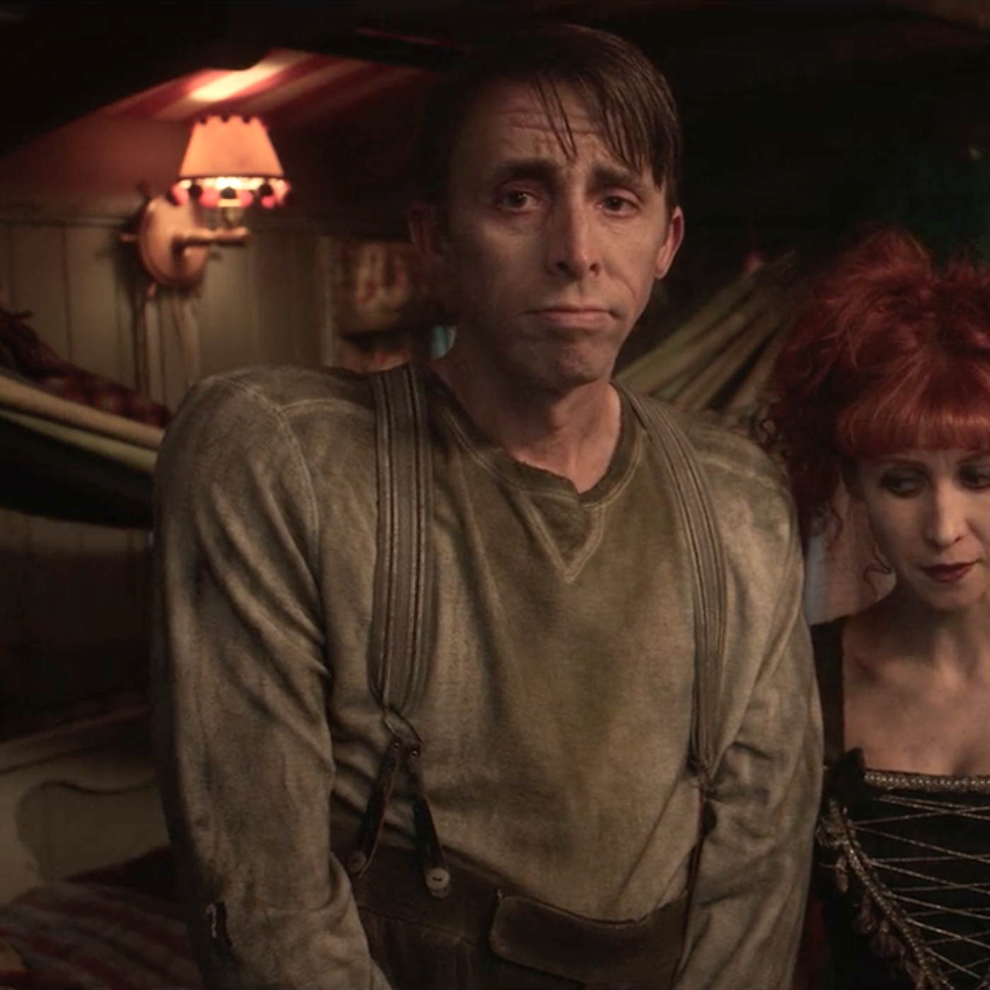 They go out to the freakshow tent, where the Hook-Handed man has a Tagliatelle Grande to hit them with if they don't obey. Hugo assures him that they are professionals before they take their places onstage. They are heckled by the crowd, and Hugo performs by attempting to put on a normal coat, which rips over his hunchback. He retreats, blushing, while the others perform.