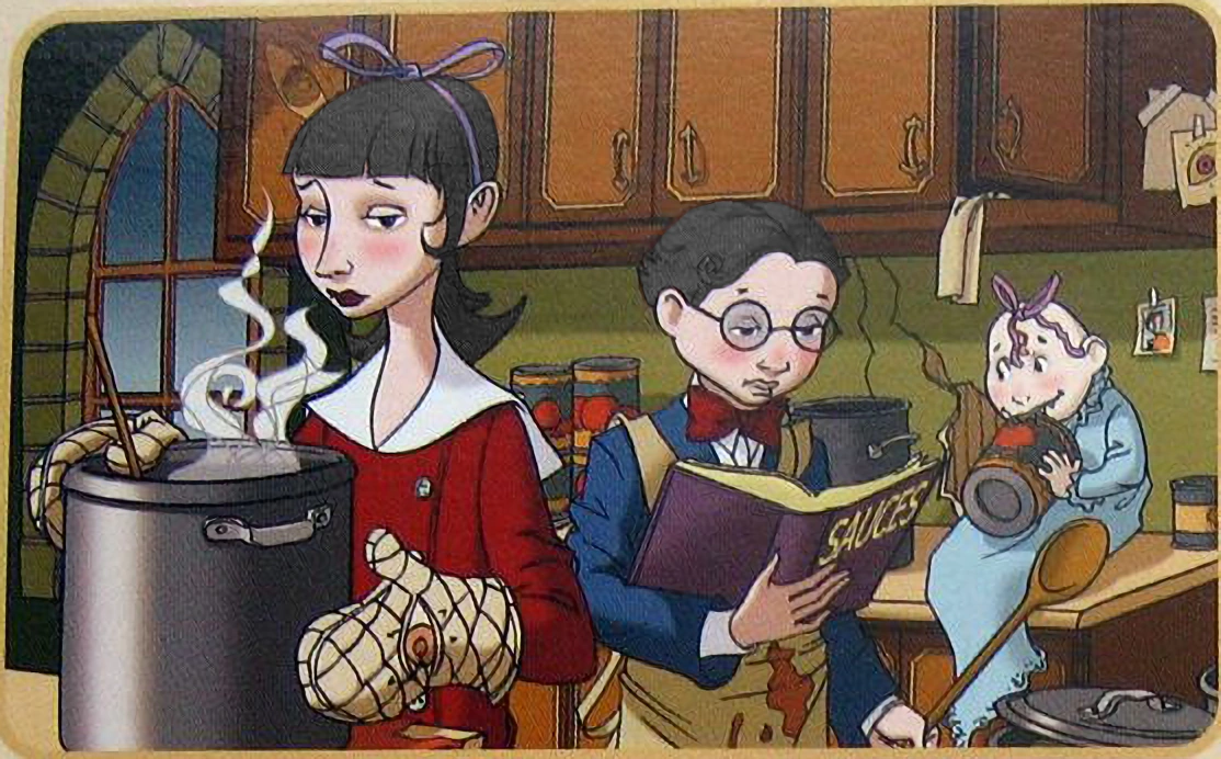 Afterwards, when the Baudelaires re-entered the kitchen, Violet caught a glimpse of the sauce and it reminded her of a vat of blood, symbolically representing how Olaf's outburst negatively affected their mood.[1]