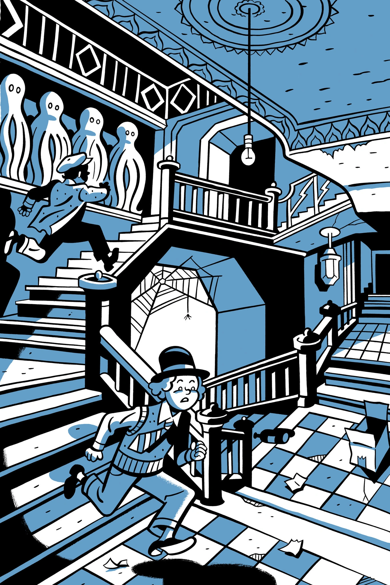 The entire mansion is confusing because of its conflicting architectural styles. The house is full of long hallways that ate empty but used to contain furniture like carpets. Towards the end of the book, the entire house has been stripped of its odd furniture. The floors are now bare. Potted plants are missing, and have left rungs where they used to be. At the end of these such hallways is a wide winding staircase with a wired lightbulb hanging above it. The upstairs hallways are lined with uninhabited empty rooms that are completely bare. The hastily arranged furniture meant to trick the viewer has disappeared. One room contains only a mattress and a few pillows, where someone evidently has been sleeping.