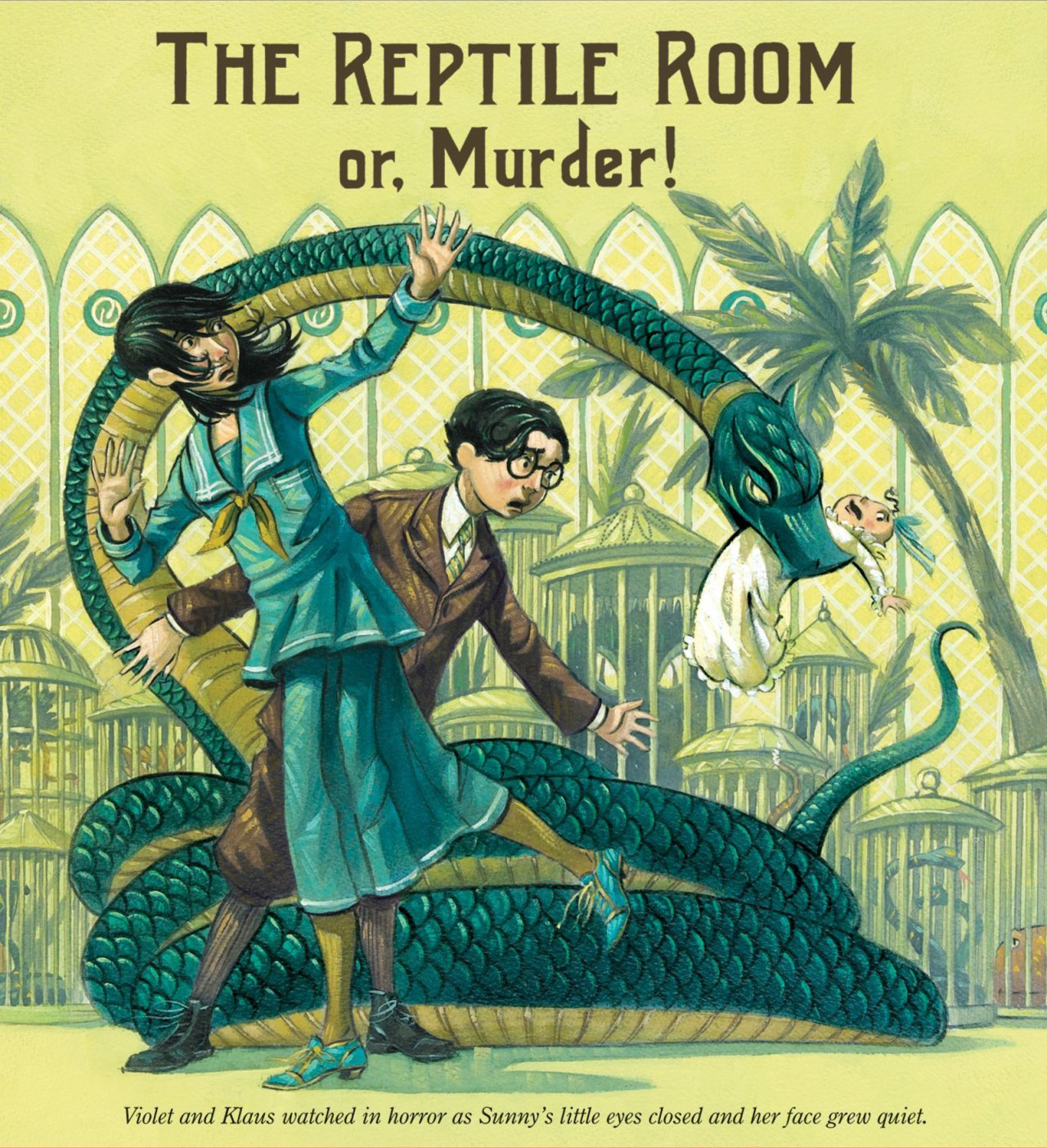 Monty explains to them that he is a herpetologist and that in ten days they are all to leave on an expedition to Peru. Violet volunteers to learn about snake traps and test theirs so as not to harm the snakes they hope to catch. The children show Poe to his car, and then excitedly return to Monty can show them his Reptile Room. The children are amazed, and Monty decides to show them his newest discovery, the Incredibly Deadly Viper. It escapes and bites Sunny, which terrifies Violet and Klaus, but Monty quickly assures them that its name is a misnomer and the snake is perfectly harmless. Violet asks if there are snakes in the room that are dangerous, and he tells them that there are, but that they are kept safely locked up.