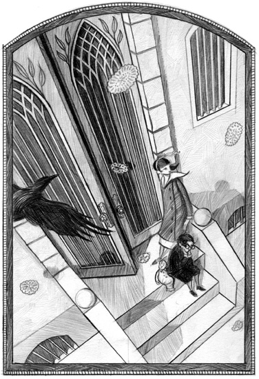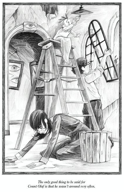 Mr. Poe drives the Baudelaires to the street where Count Olaf resides, but not before stopping by the home of Justice Strauss. The children cheerfully introduce themselves, thinking they will be living with the High Court judge. They were soon corrected when Justice Strauss revealed that she was actually Count Olaf's neighbor and were instead directed to his house, which was in severe disrepair. Violet privately thinks she would rather live in Justice Strauss' house and then proceeded to wonder why Olaf would carve a large eye on his front door.
